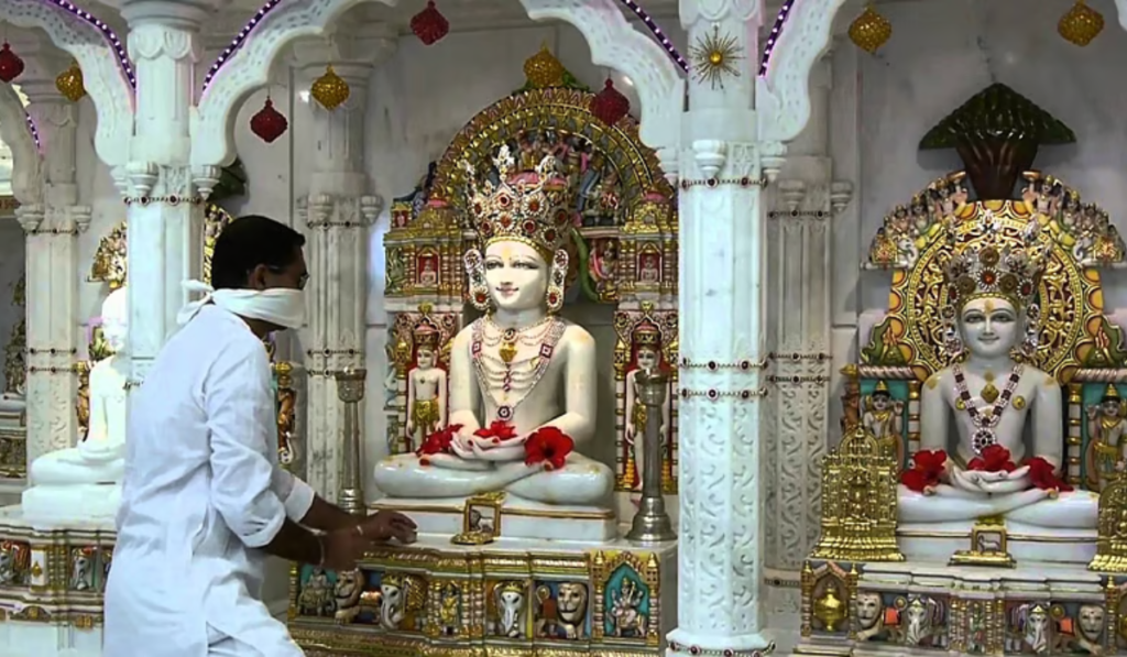 During Paryushana, Jains gather at temples or community halls to listen to sermons and read sacred texts like the Agamas.